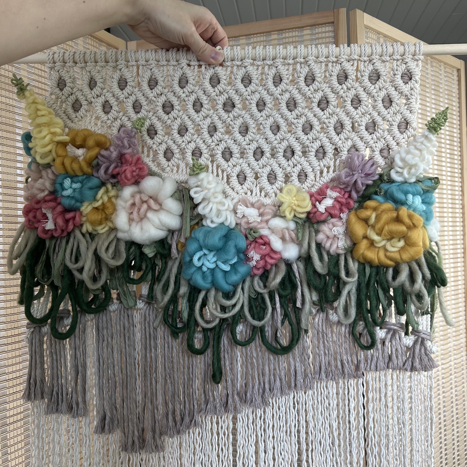 We’ll start by building the macramé "skeleton" using familiar knots, then I’ll walk you through how to add soft, fluffy blooms with macraweaving techniques using roving and yarn.